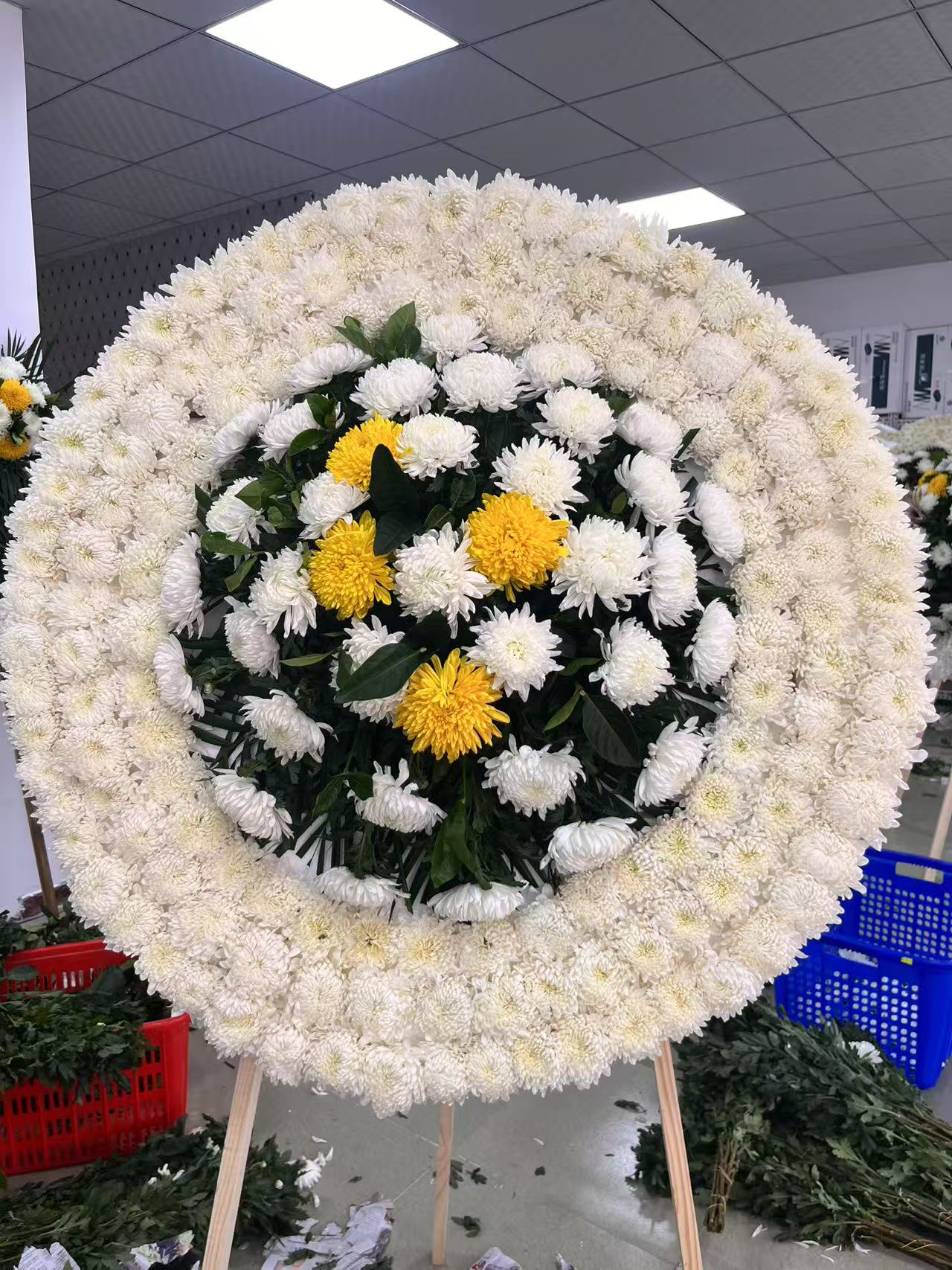 作为承载哀思的重要载体,本款花圈在材质甄选上尽显匠心。基底采用生长周期5年以上的天然毛竹,经人工筛选、高温碳化处理后,由资深工匠手工编织成圆形框架,不仅具备稳固的支撑性,更蕴含“竹报平安”的传统寓意。框架表面包裹米白色哑光缎布,触感细腻柔和,避免反光刺眼,营造肃穆氛围。